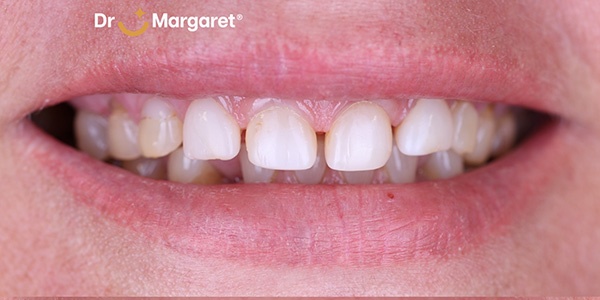 Przebarwienia, drobne przestrzenie i zaburzone proporcje wpływające na harmonię uśmiechu.