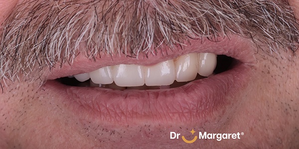 Punktem wyjścia było kompleksowe leczenie przygotowawcze, którego celem było stworzenie bezpiecznych i stabilnych warunków do dalszej odbudowy. U Pacjenta występowała zaawansowana choroba przyzębia, która w największym stopniu dotknęła zęby sieczne. Ze względu na ich znaczną ruchomość i brak możliwości zachowania ich w jamie ustnej, konieczne było ich usunięcie. Był to moment trudny emocjonalnie, wymagający zaufania i odwagi, ale jednocześnie kluczowy, by móc realnie zmienić jakość życia Pacjenta. W kolejnych etapach leczenia wprowadzono implanty, które stały się stabilnym fundamentem nowego uśmiechu. Odbudowa została uzupełniona o mosty oraz korony pełnocyrkonowe, zaprojektowane w taki sposób, aby przywrócić naturalne proporcje, harmonię twarzy oraz komfort funkcjonowania. Cały proces był poprzedzony dokładną higienizacją i leczeniem przygotowawczym, a zakończony odbudową również w odcinkach bocznych, co pozwoliło Pacjentowi odzyskać pełną funkcję żucia i poczucie bezpieczeństwa na co dzień.