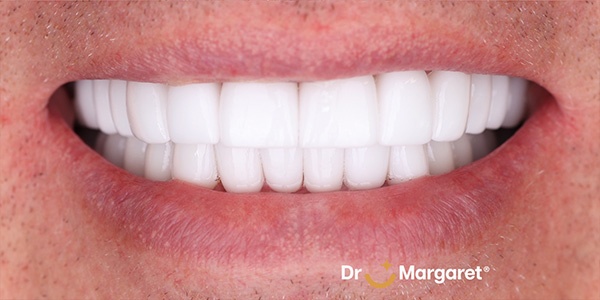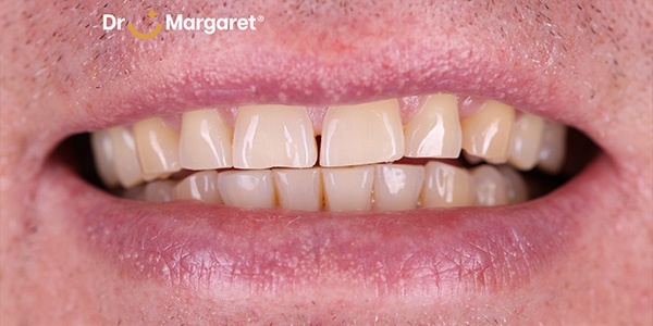 Proces leczenia opierał się na dialogu i świadomych decyzjach. Każdy element — od koloru, przez kształt, po końcowy charakter uśmiechu — był omawiany i dopasowywany tak, aby efekt był wyrazisty, jasny i efektowny, a jednocześnie harmonijny z twarzą, mimiką i stylem Pacjenta. Zastosowanie pełnoceramicznych licówek i koron pozwoliło osiągnąć spektakularny efekt wizualny, a jednocześnie zabezpieczyć zęby przed dalszym starciem i zapewnić trwałość odbudowy.